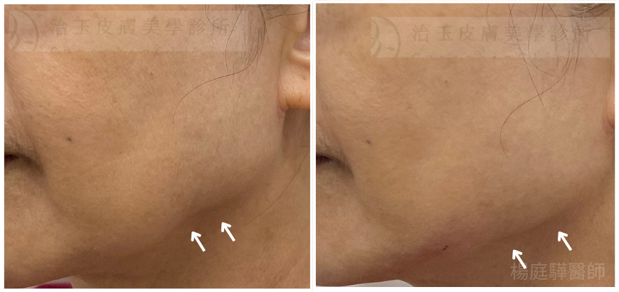 另一種常見情況是,下顎線條本身出現凹陷,或線條看起來中斷、不連續,這往往與下顎骨支撐流失有關。 隨著年齡增長,骨骼會逐漸吸收與變化,原本俐落的下顎轉折也因此出現斷層,這也是許多人忽略,但對輪廓線影響極大的原因之一。 這類型問題,可透過高支撐性的填充物,以「結構性重建」的方式微調下顎線條,重新建立輪廓的基礎。